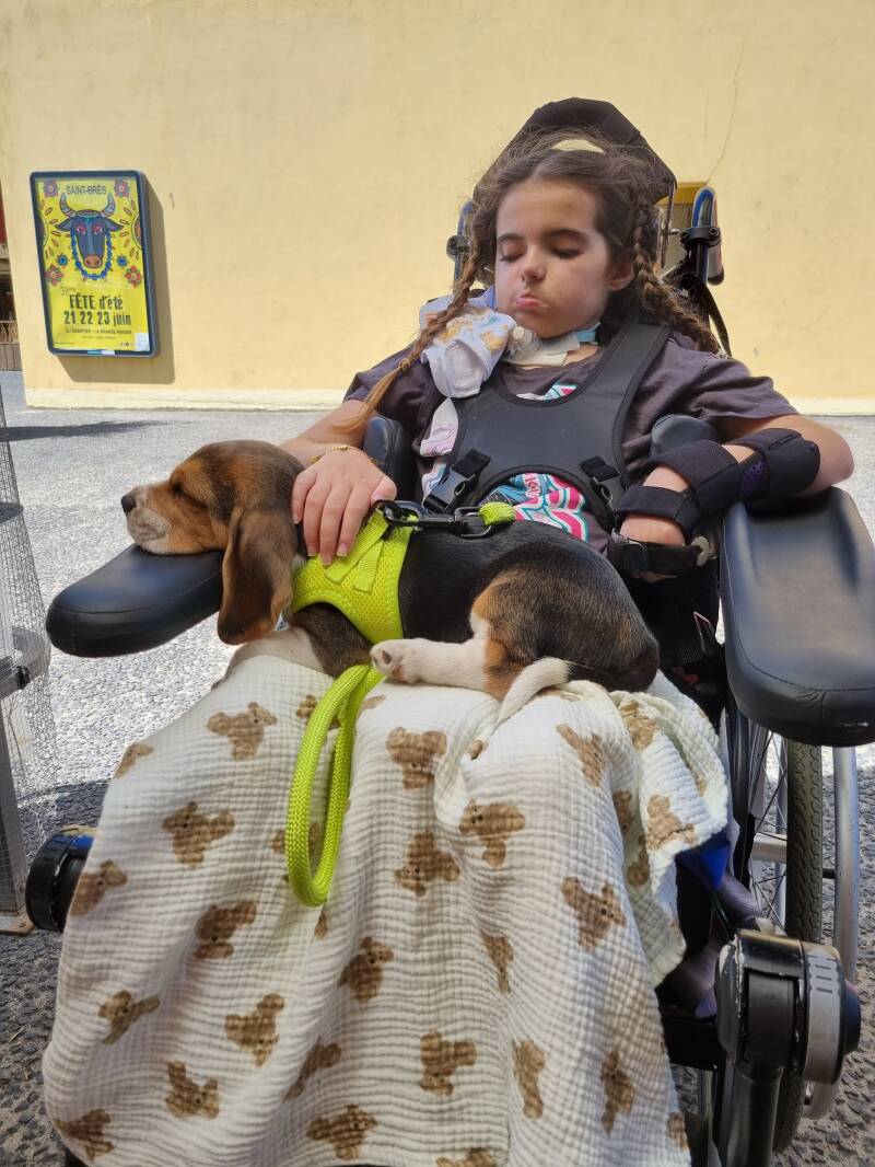 Volf et Inès sont inséparables, à la maison comme au centre. On profite qu'il ne fasse pas trop chaud en ce début d'été. Inès part au centre avec papa et je les rejoins après le travail. Volf n'est pas seul à la maison, mamie vient garder la grande mais va très vite apprendre la patience en voiture et il ne lui faudra pas longtemps pour demander sa laisse dès que je rentre et me montrer la voiture. Lui aussi à hâte de retrouver sa maîtresse. Dès que le planning le permet (généralement en fin de matinée après la séance kiné, inès se faufile sous le porche avec papa pour retrouver son chien. Bien qu'il n'ait pas le droit de rentrer il devient la petite mascotte. Volf apprécie énormément les siestes ou les balades.... au fauteuil.